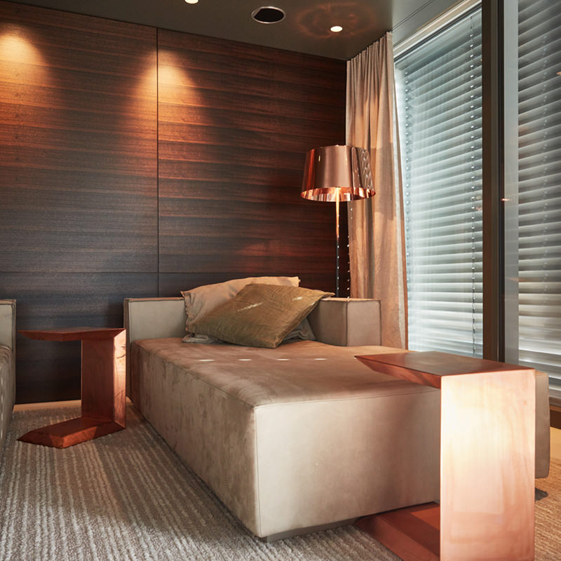 Der Raum wurde mit einzigartigen Möbeln, handmade by Eberharter, dekoriert und sorgfältig mit schönen Details aus Kupfer, Nabuk Leder, Leinen und Bambusfasern addiert sowie abgerundet. Diese wahrhaft einzigartigen Materialien wurden direkt in unserer Manufaktur geschaffen. Der schwarze Boden und der sichtbare Beton verleihen dem Loft dazu noch mehr Charakter - klar, souverän und doch behaglich..
